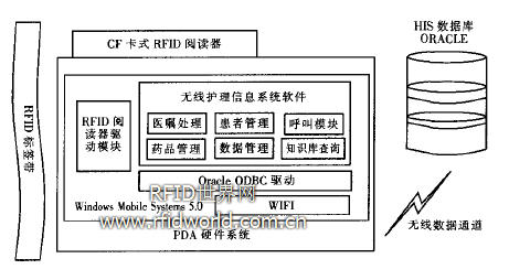 3.2 系统总体结构 系统运行环境为Windows Mobile Svstem 5.0,PDA上安装CF卡式RFID阅读器,通过驱动程序将标签上的数据传送给护理信息系统,实现患者和药品的唯一性确认。护理信息系统通过0racle0DBC驱动程序连接HlS数据库,实现数据交互,链路层上通过无线网络实现。护理信息系统软件由患者管理、药品管理、医嘱处理、数据管理、知识库查询和呼叫模块组成。基于RFID的无线护理信息系统的总体结构如图2所示。