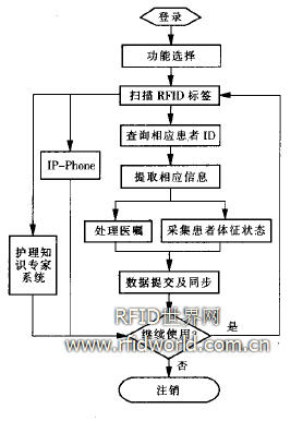 图3 软件流程图 流程中,首先进行登录和功能选择。然后根据所选模块完成对医嘱执行全过程的监控,或者选择基于WIFl的IP—PH0NE功能。如果要实现信息查询,则进入护理知识专家系统。所有操作最终完成后,注销系统。 5 结束语 本文基于RFID实现了无线护理信息系统,实现了患者身份和药品的正确识别,实现了医嘱的闭环执行,有效地预防和避免了医疗差错的发生。下一步研究应着重解决医院内无线网络安全以及RFID自身的信息安全和患者隐私数据的保护。( |